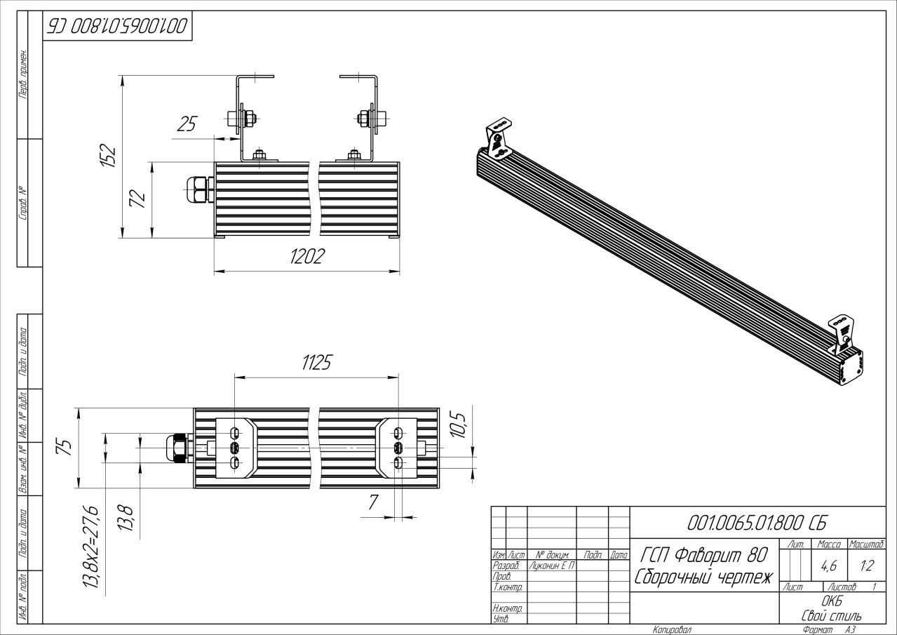 | Габаритные размеры (ДxШxВ), мм | 1202x75x72 |