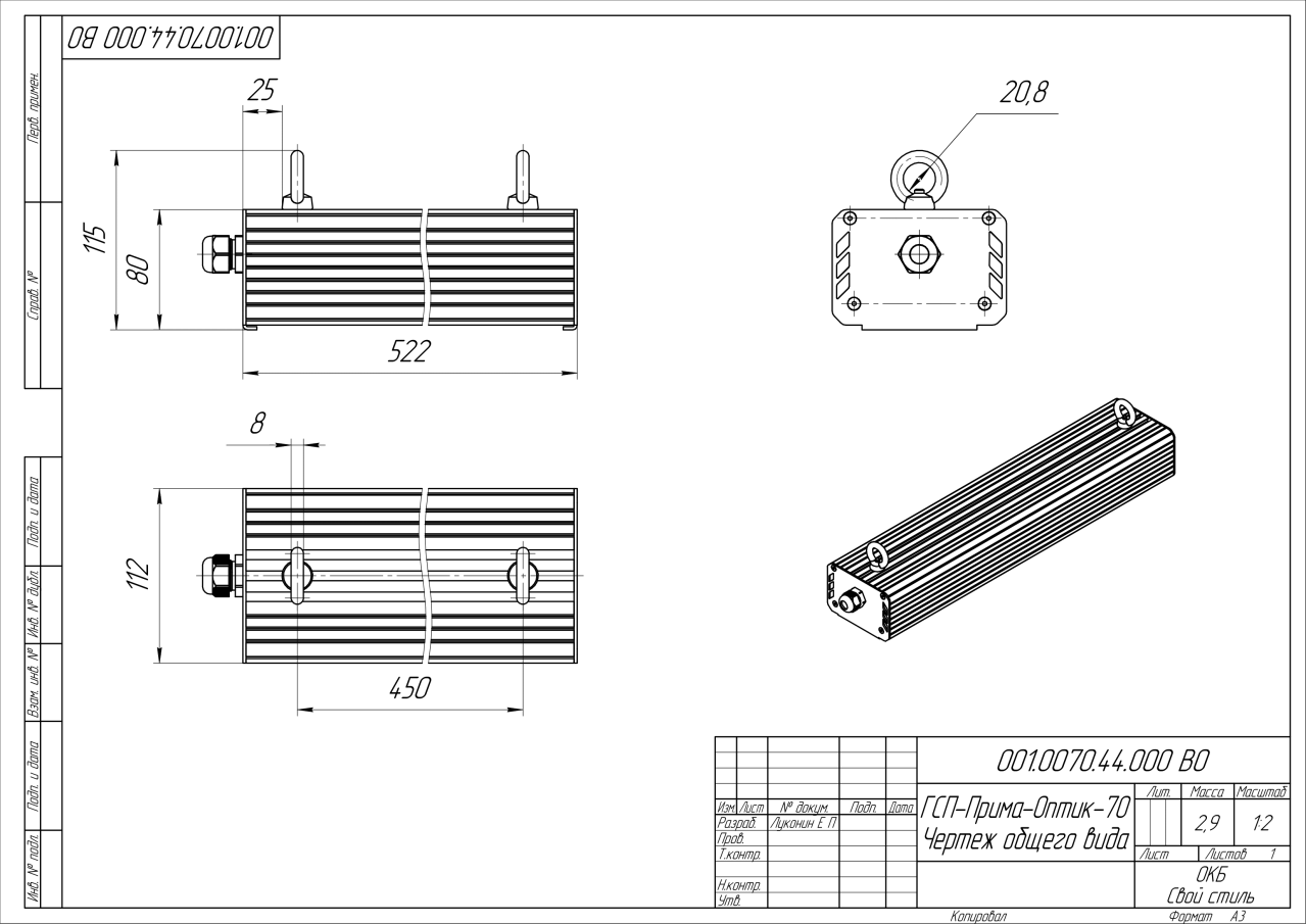 | Габаритные размеры (ДxШxВ), мм | 522х112х80 |