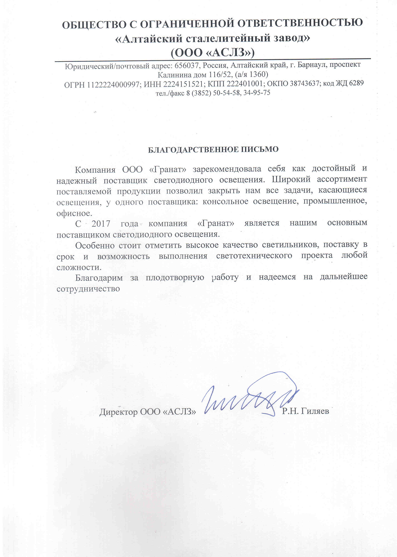 Выражаем глубокую признательность и желание дальнейшего сотрудничества с ООО "Гранат" в области поставок светодиодного оборудования."